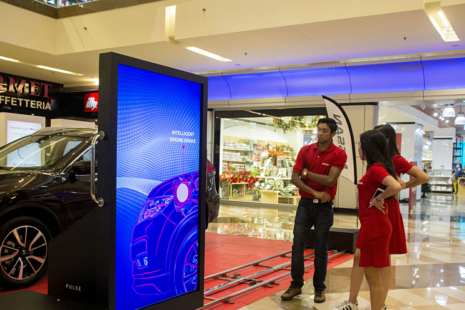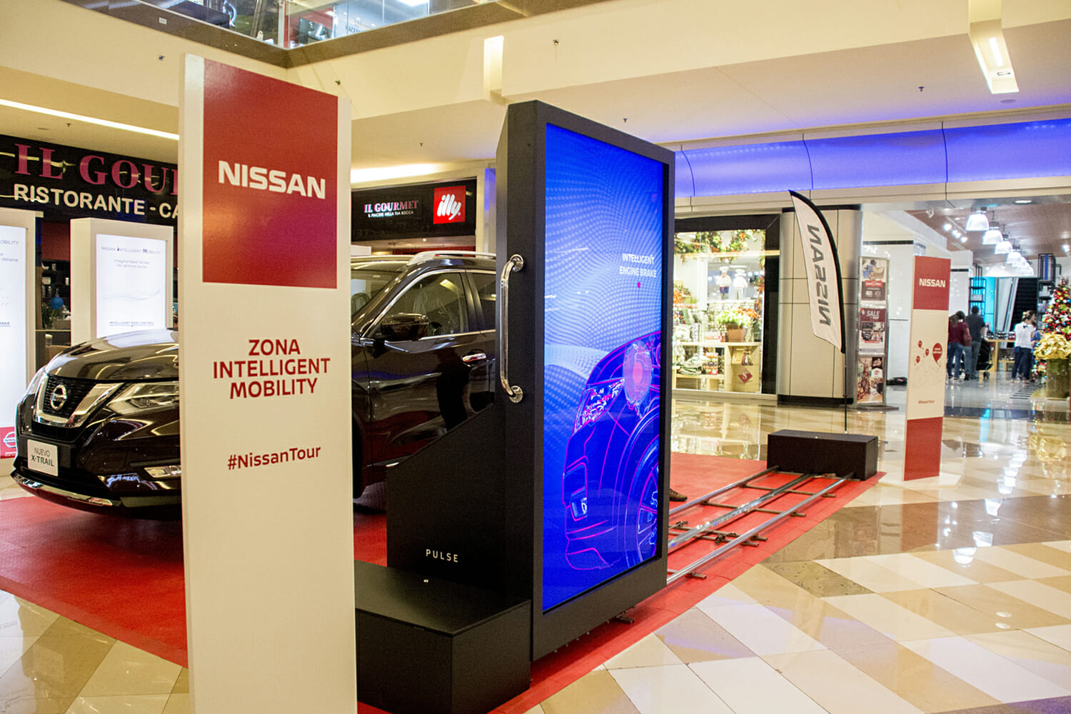 Una instalación interactiva de tracking en tiempo real diseñada a medida para el XTrail, causando asombro e interés para obtener información sobre la tecnología Nissan.